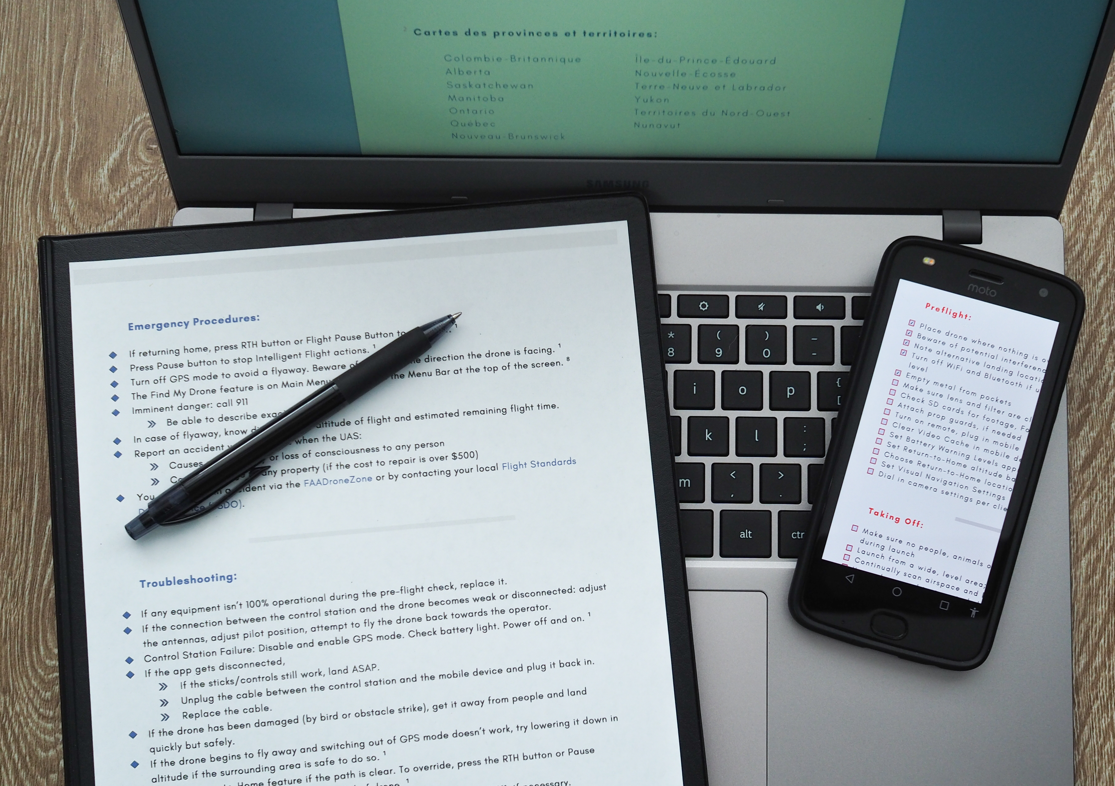 Our signature product is the Flight Checklist and Emergency Procedures document. It’s a Pre-Flight Hub that was designed to be used on your computer at home, your mobile device in the field or printed out and included in your kit. It’s full of links that take you to the sites needed for flight planning and airspace authorization. Similar to an app on your phone, the intention is to have everything at your fingertips, but accessible in multiple ways.