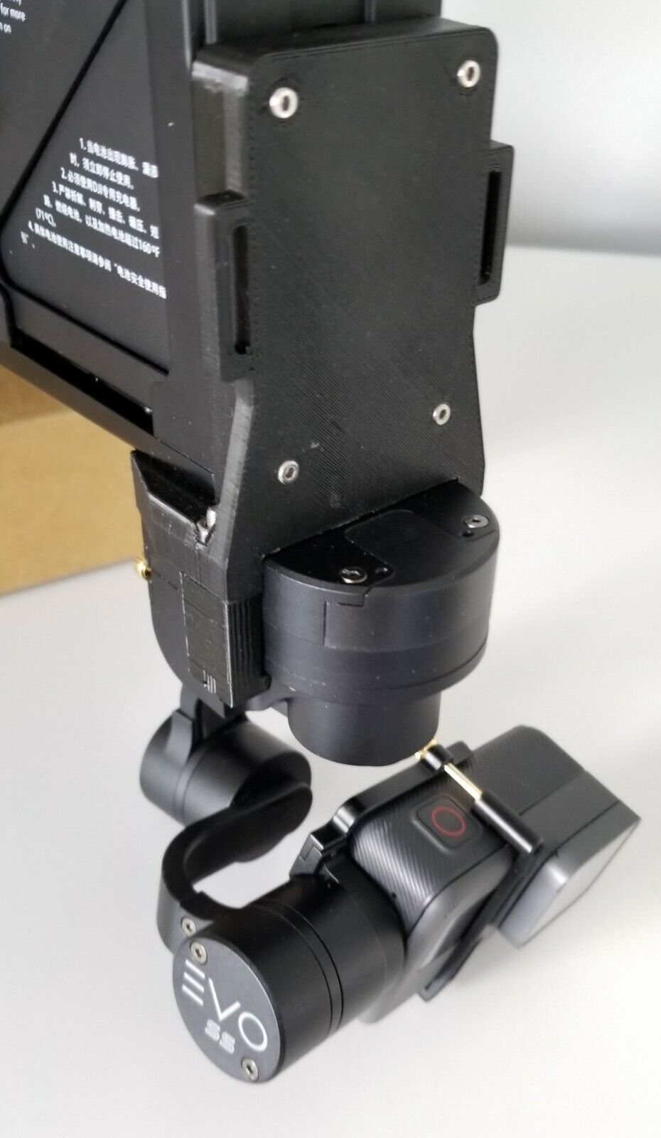 I needed a gimbal to control the horizon. I found a self-contained gimbal made by EVO called the SS. It fit many of the available cameras and was easily modified to accept custom scenarios. The EVO SS was heavy—weighing above 370g (with a GP Hero 4). This worked best on a drone with heavier payload handling. I had a DJI P2Z that had a gimbal and carried the GoPro 4 series easily. However, I was not comfortable adding a second rear facing camera. In late 2017, I purchased my first DJI Inspire 1. My goal was to mount a second camera on the rear and center top using the EVO SS and no suspension.