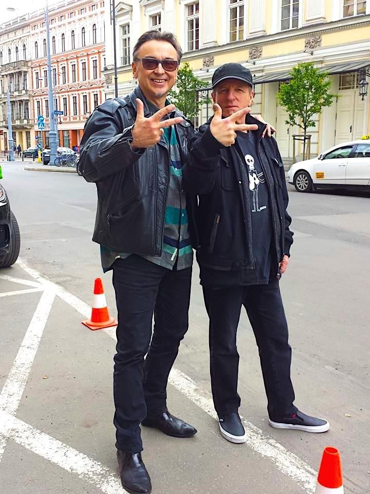 Left: Cichoński leading the performace of "Hey Joe" on the main stage in 2022 [Photo by Henryk Michaluk]. Right: Cichoński and I flashing his "Universal Vibrations" or "UniVibe" sign that represents hope, unity, and love. “I’m trying to show the power of music to unite us all,” he told me in 2019. “So many things seek to separate us these days, but UniVibe is all about uniting us. I ask all musicians to show awareness for this sign. Let’s change the world!”