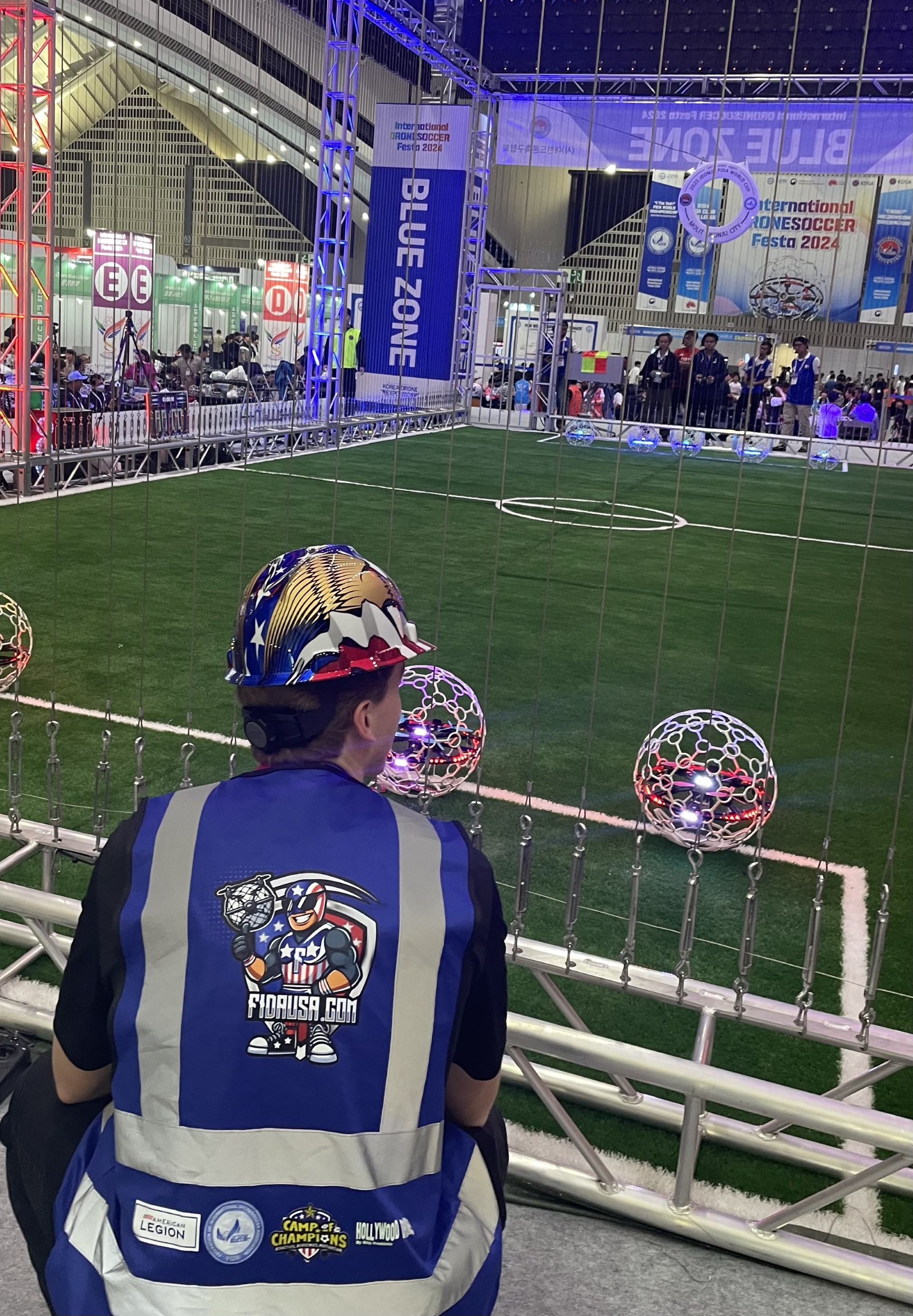 My introduction to drone soccer started in 2021 at Commercial UAV in Las Vegas. At this conference, my team (Hollywood drones, Grossmont College & Camp of Champions) met Moon Hee Suh, Director & Board Member of FIDA (Federation of International Dronesoccer Association). We were amazed by this new-found sport incorporating drones in a soccer field-like caged arena (imagine Harry Potter Quidditch without the brooms!). I was soon introducing drone soccer to elementary through high school students all summer in Palm Springs School District and Saturday drone boot camps.