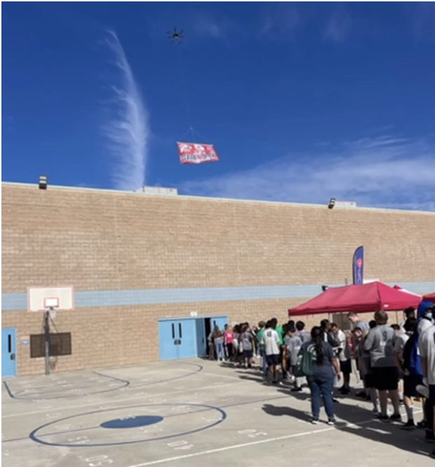The Great Oak Drone Squadron outfitted their Matrice 600 with an A2Z Drone Delivery RDS2 commercial drone winch. Able to attach to just about any drone platform, the commercial drone winch allowed the team to hang large banners and flags from the Matrice. When the school hosts large events like football games, graduation ceremonies, etc. the Great Oak Drone Squadron not only documents the event from the air, but student pilots fly in a large custom-made 10 x 15 foot American flag as part of the school’s color guard procession.