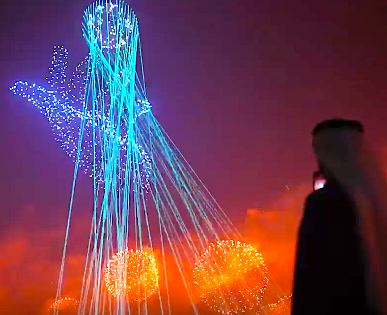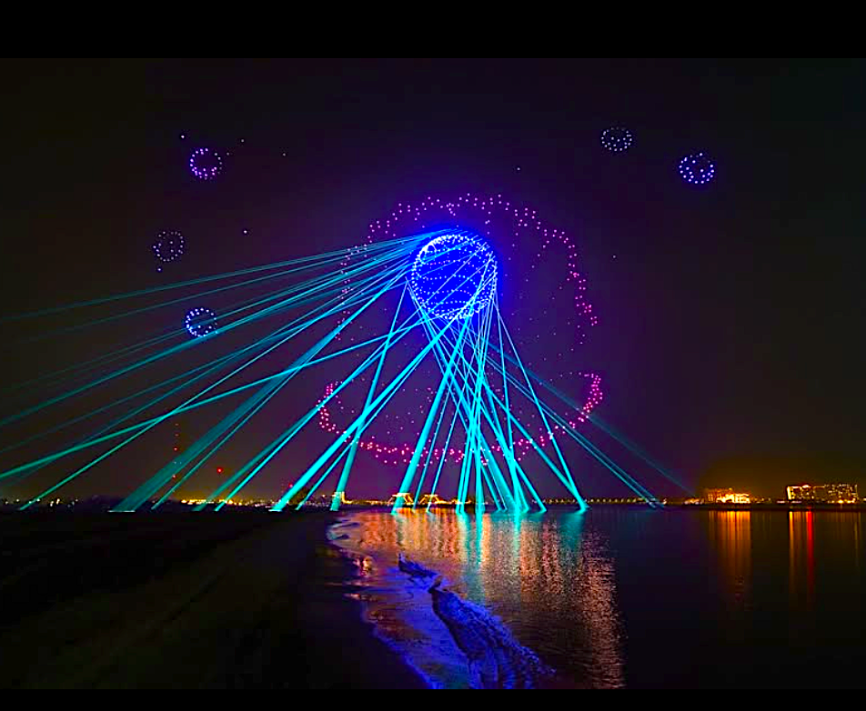The new tech dropped at a the Fireworks by Grucci New Year’s Eve show at Ras Al Khaimah in the United Arab Emirates. In a fleet of 1,400 conventional LED drones, 47 of the new laser drones were added to the production.