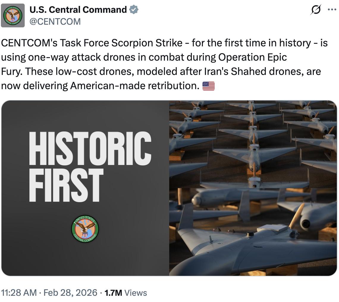 Following the initial wave of U.S. and partner strikes, CENTCOM forces successfully defended against hundreds of Iranian missile and drone attacks. The first hours of the operation included precision munitions launched from air, land, and sea. Additionally, CENTCOM’s Task Force Scorpion Strike employed low-cost one-way attack drones for the first time in combat.