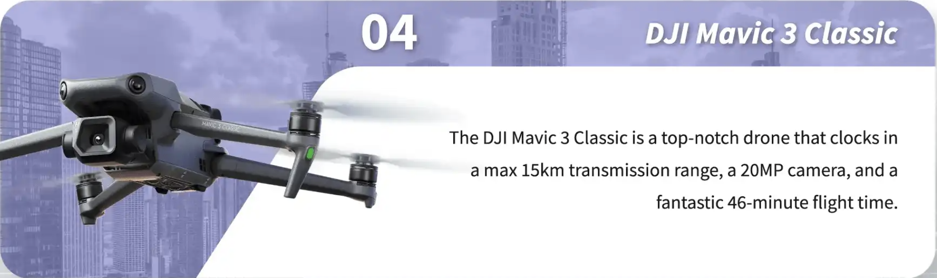 Following closely is the Mavic 3 Classic. If you're seeking a premium flying camera without a hefty price tag, this drone could be your perfect match. While it may not match the Mavic 3 Pro in photography and filming, the Mavic 3 Classic certainly doesn't fall short in flight performance.