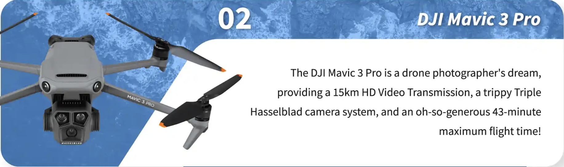 DJI has been making some serious waves in the drone world with the Mavic 3 Pro. This flagship drone features a world-first triple camera system, allowing you to switch between shot compositions with just a tap. Each camera provides a different focal length (24mm/70mm/166mm), providing you with incredible versatility for your aerial storytelling.