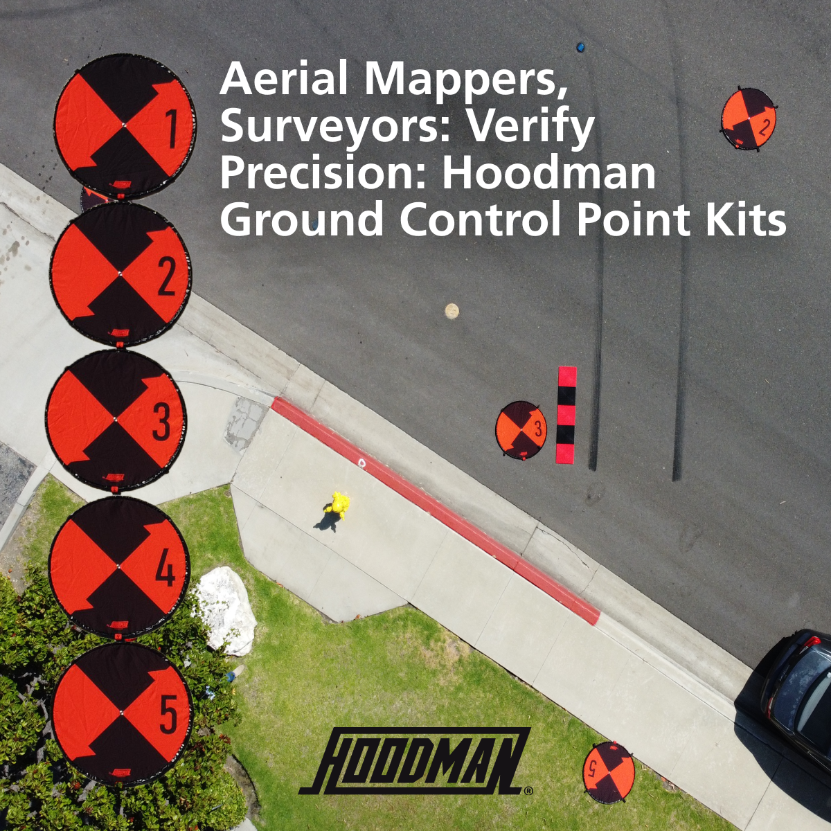 Hoodman makes Highly Visible Ground Control Point (GCP) Kits that come in convenient 5-pad sets, each clearly numbered from 1 to 5. Every pad features a durable center steel grommet with a reinforced plastic backing, allowing you to easily position your RTK staff directly at the center of the pad for precise alignment. Each kit includes a practical carry bag with a shoulder strap, making deployment and storage efficient.
