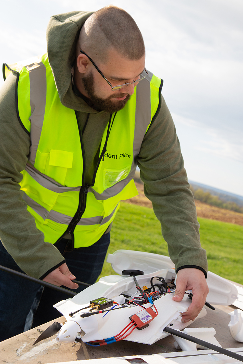 Beckendorf prepares a fixed-wing drone for test flight that he customized with upgraded electronic components in his Advanced UAS Systems class.