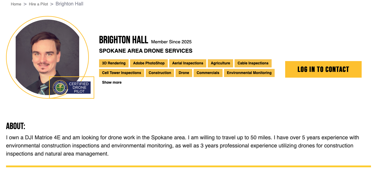 The biggest mistake pilots make here is just putting, “Pilot, Part 107”. Sell yourself and be truthful. Tell the potential clients about your services that you offer and if you speak another language apart from English let them know. It can sometimes make the difference between being hired or not. Also, don’t write your life story up there, keep your info to around 150/200 words. Here is an example of one of our pilots “About” sections that works. Direct and to the point: