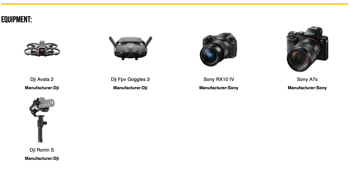 Displaying good pictures of your equipment will let the more decerning potential clients know at a glance if you are right for their job. Rather than try to take pictures of your drones and cameras yourself just go to Amazon and screenshot their photos, they’ve already done the work for you. Also, if you have other equipment other than drones like professional cameras etc. add those as well because they may want you to supply them with still shots as well as drone video footage.