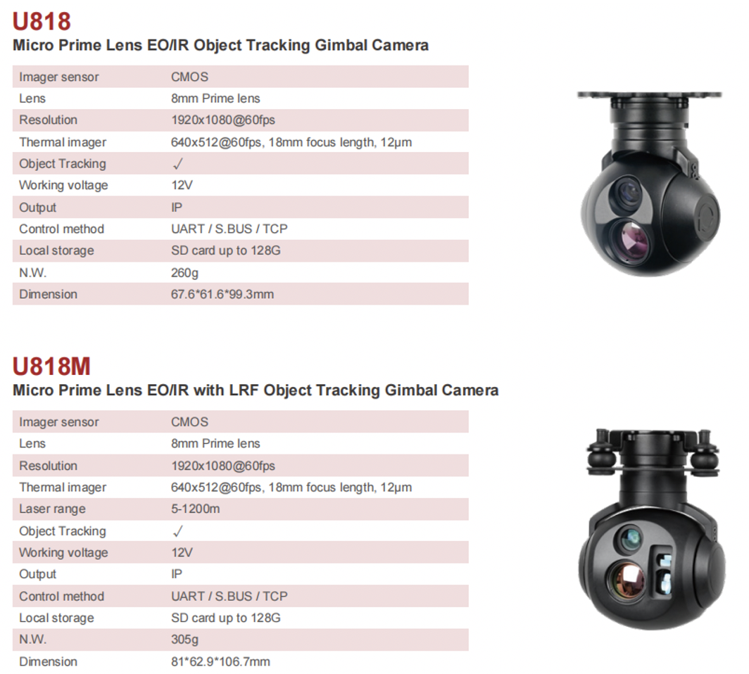 Among Hawkeye series, U818 and U818 camera caught my attention, U818 is 2-axis EO/IR camera with ultra light weight 300g, The day camera resolution is 1920*1080 with 4x digital zoom and the IR thermal is 640*512 pixel. U818M is the upgrade version of U818, with extra 1200m Laser range finder, moreover, it shows GPS coordinate of target object on the OSD.