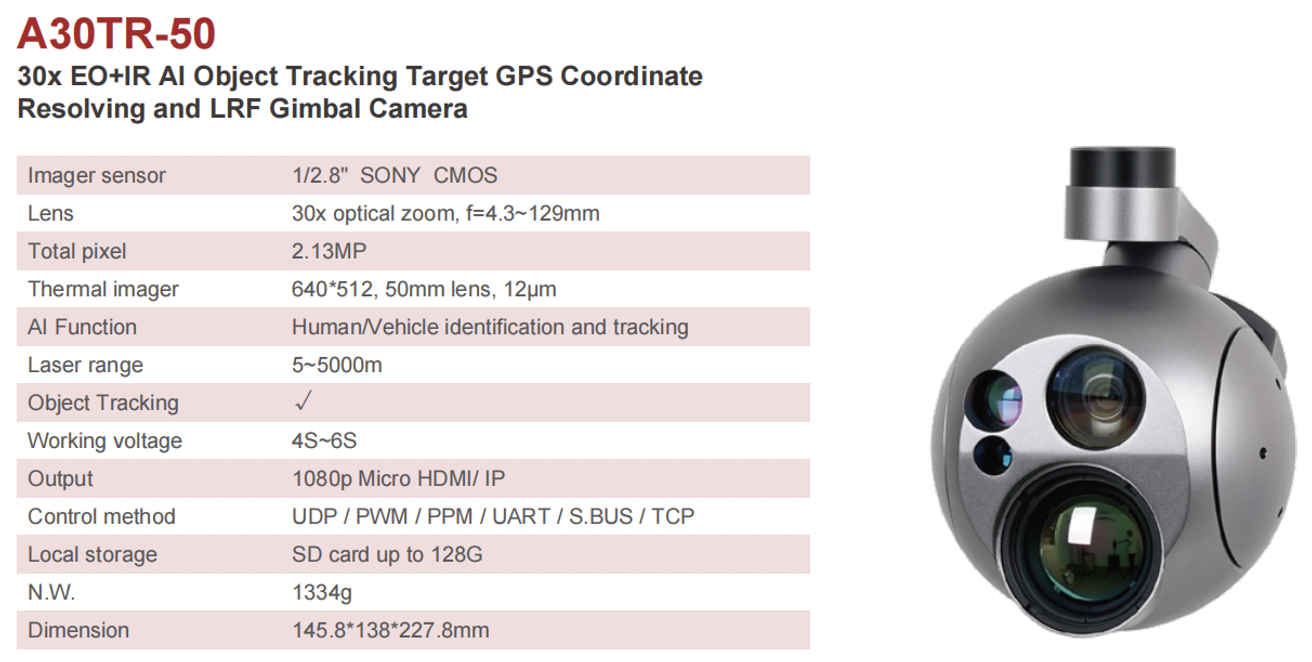 Among the AI series, A30TR-50 is a 3-axis high-precision gimbal that integrates an AI-based sensor with a 30x optical zoom, 360x hybrid zoom EO SONY camera, 50mm 640*512 12μm IR thermal sensor which has longer thermal detection distance. Lastly, 5km rangefinder(10km optional) can literately calculate the target GPS coordinate and distance. A30TR-50 can be installed on all kinds of drones for public safety, first response, inspections, patrol, disaster prevention, emergency monitoring inspections, search and rescue, etc.