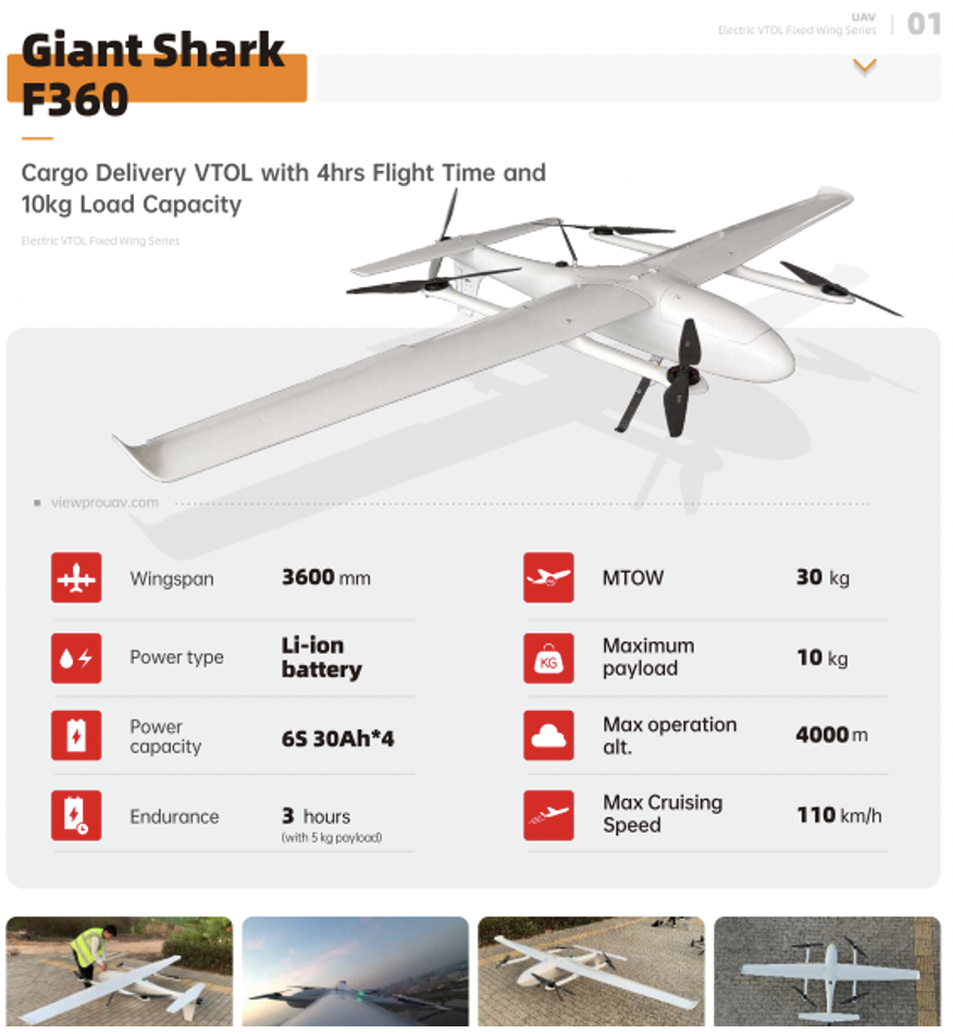 Another VTOL recommended is Giant Shark F360. With Wingspan 3600mm, 30 MTOW, Li-ion battery, and the maximum payload is 10kg, with 5kg payload can keep 3h flying. Max operation is c 4000m. It’s a popular combination with A40T and 50km data and video transmitter for search and rescue, or package delivery applications.