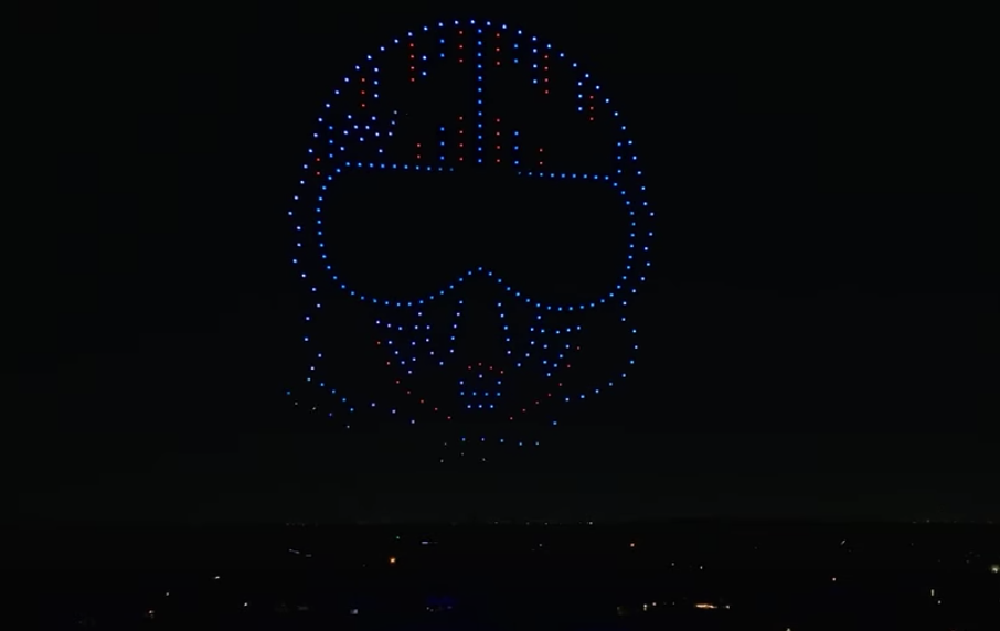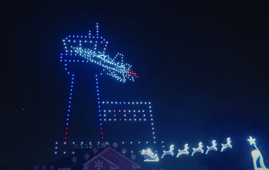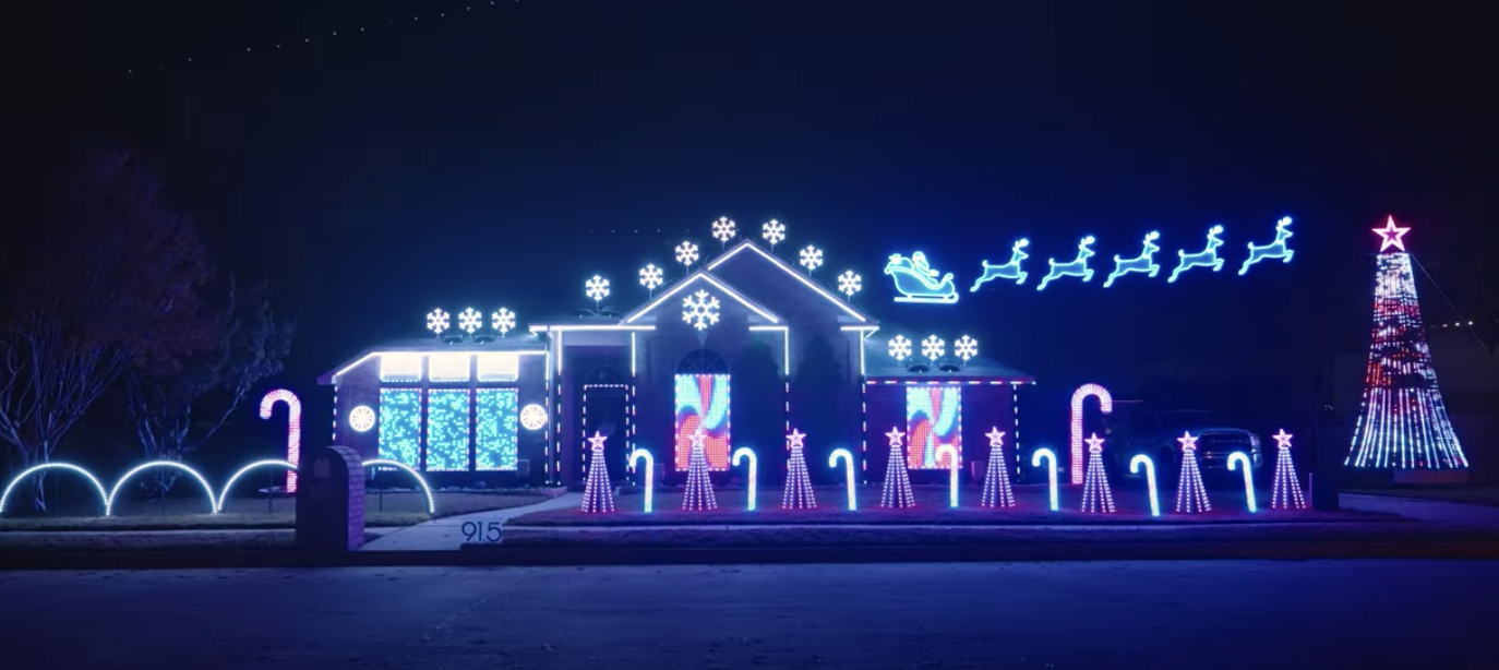 A celebratory home holiday extravaganza added some Top Gun: Maverick drama via a 400-drone light show above the candy canes, Christmas trees, and Santa and his reindeer. Sky Elements Drones provided the jet fighters and other film scenes to "Mach 10" the otherwise traditional holiday decorations.