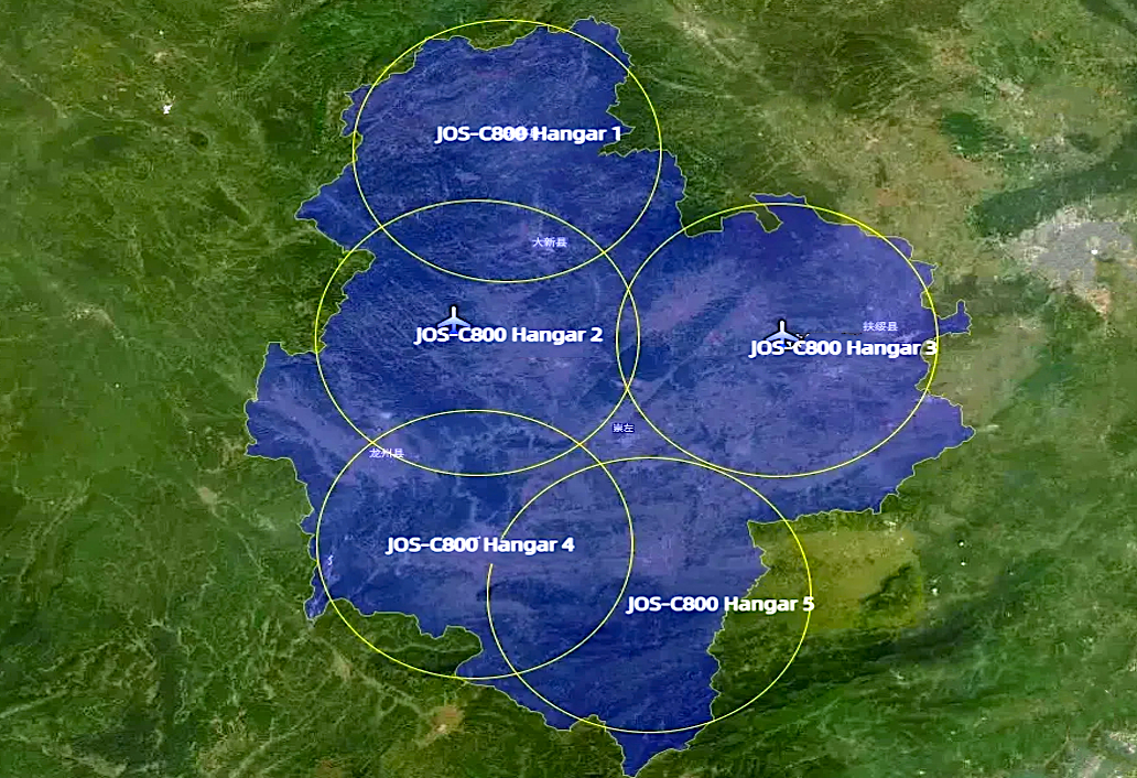 The system strategically deploys five JOUAV JOS-C800 VTOL hangars and two CW-15V drones to address inspection challenges in mountainous terrain. Each CW-15V VTOL drone is capable of automated missions within a 50-kilometer radius, featuring up to three-hour flight endurance. The two drones “hop” between hangars, autonomously recharging to sustain continuous operations. By utilizing autonomous drones and fixed mobile docking stations, the system is able to cover up to 15,000 square kilometers with seamless, fully remote operations.