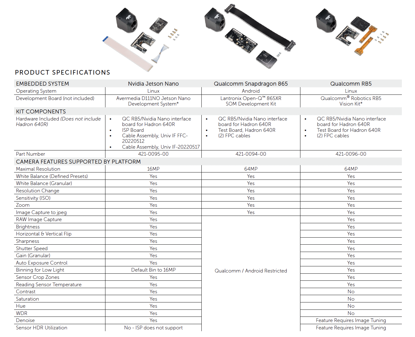 Hadron 640R development kits pair the performance-leading Hadron 640R with hardware and reference software drivers for quick integration with development boards supporting the Qualcomm RB5, the NVIDIA Jetson Nano, and the Qualcomm Snapdragon 865.