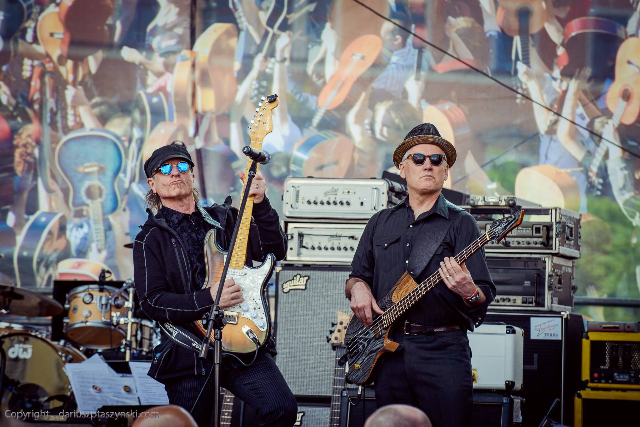 Molenda performing "Hey Joe" with bassist/actor David Price on the Wroclaw Market Square stage in 2018.