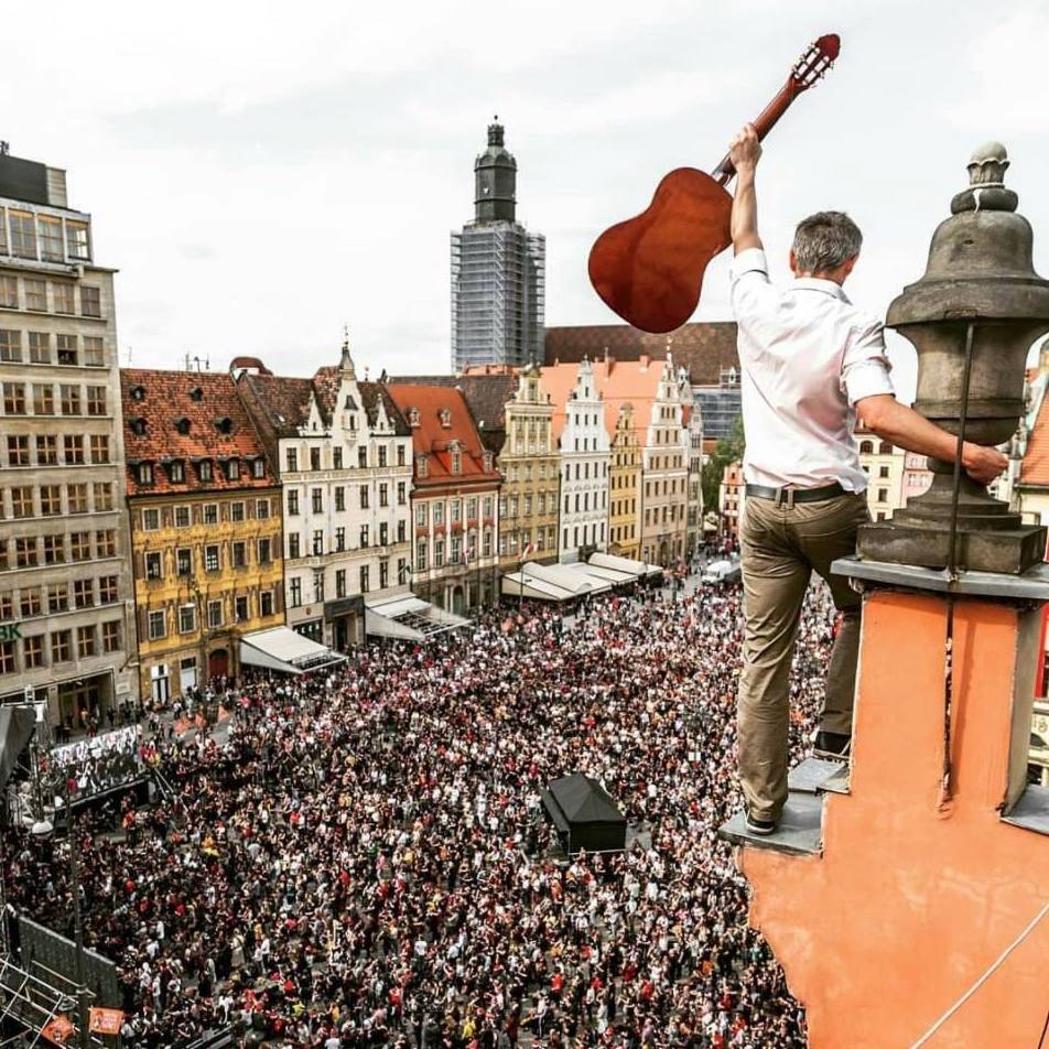 A (very) brave guitarist above the Gitarowy Rekord Guinnessa crowd at Wroclaw's Market Square.