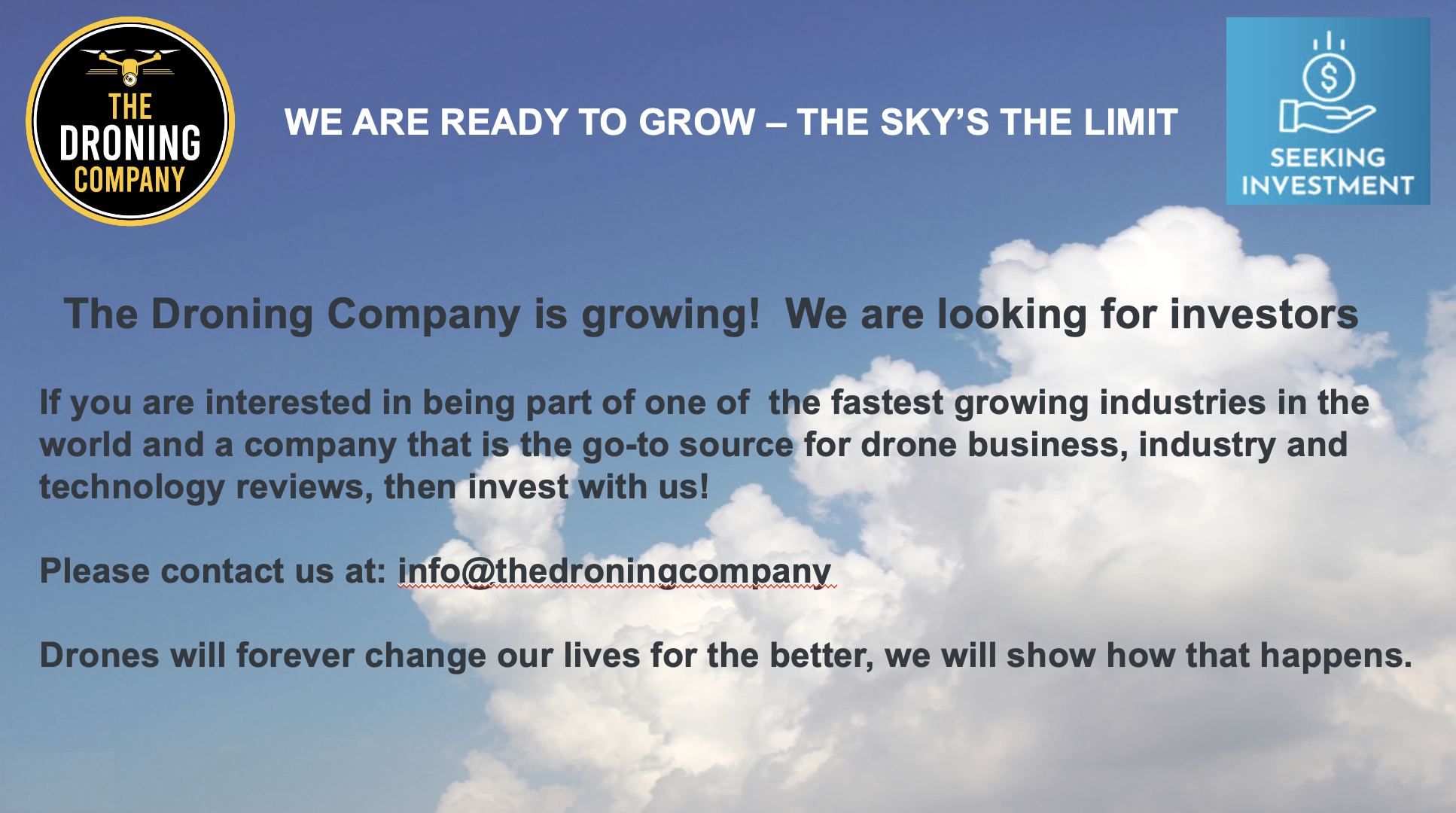 Be a part of the next phase of our skyrocketing growth. Contact info@thedroningcompany.com for details.