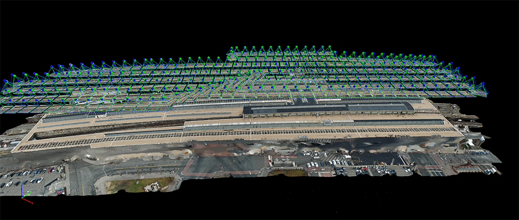 A 3D model from Pix4Dmapper of the roof at Penn Station Newark reveals how the mission was confined to the horizontal limits of the building and the number of individual images taken in order to composite the entire work area.